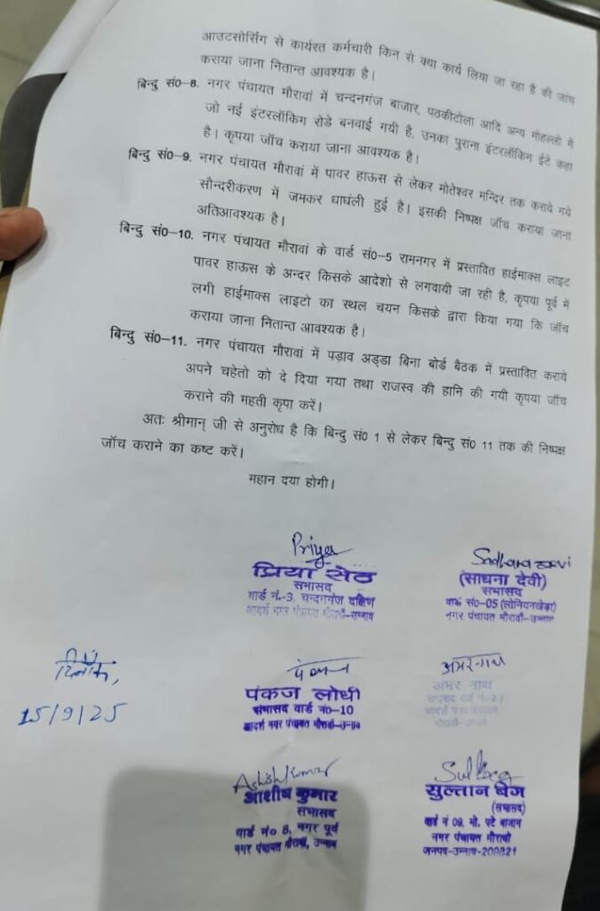 मौरावां नगर पंचायत में भ्रष्टाचार और अनियमितताओं का मुद्दा एक बार फिर गहराता जा रहा है। नगर पंचायत के सभासदों ने अध्यक्ष पर गंभीर आरोप लगाते हुए जिला अधिकारी को ज्ञापन सौंपा है। सभासदों का कहना है कि बीते दो से तीन महीनों में कराए गए विकास कार्यों में बड़े पैमाने पर गड़बड़ियां की गई हैं, जिनकी निष्पक्ष जांच आवश्यक है।